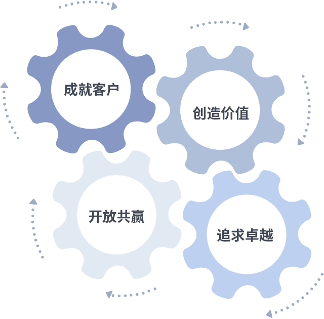 成就客户是一切决策的出发点,,创造价值是衡量所有工作的标准,,追求卓越是我们做事做人的态度,,,,开放共赢是我们的格局也是最终的结果。。价值观的齿轮环环相扣,,推动着组织里的每个人不断向前。。