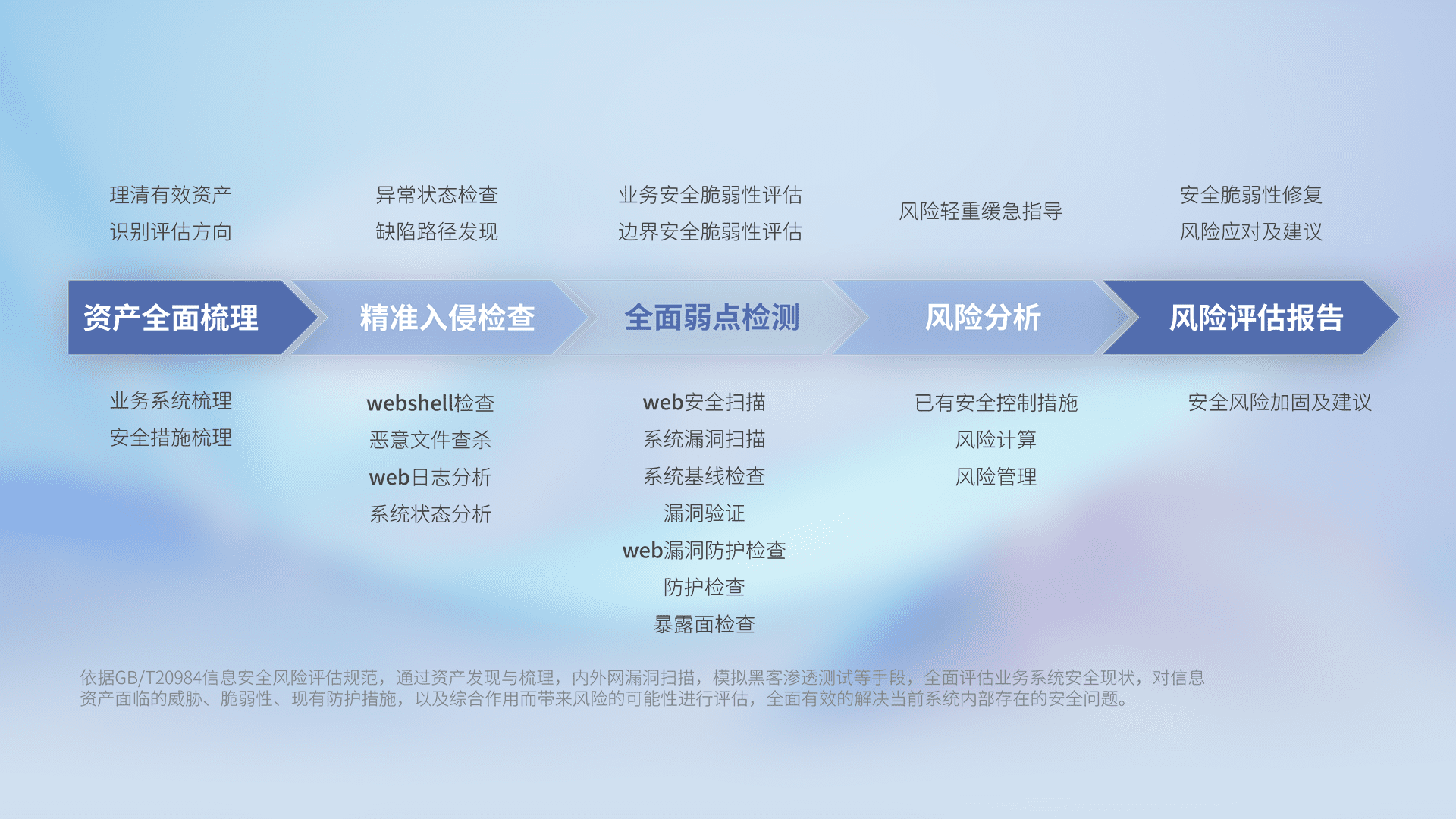 针对客户行业特性,,,,以专业的安全服务+多厂商联合解决方案提供专属的一站式安全管理服务,,帮助客户全面感知网络空间威胁,,,基于识别、、、、检测、、、、分析、、防护、、、监测、、、响应的服务理论模型,,,从方案咨询、、、、集成交付、、、评估验证、、、、优化加固、、运维运营,,致力于为客户提供完整的闭环管理式安全服务。。。以实战经验为客户打造高抵御风险的安全体系,,,帮助客户发现威胁、、对抗威胁、、、处置威胁,,,不断积累安全对抗能力,,持续保障数字化安全。。。。